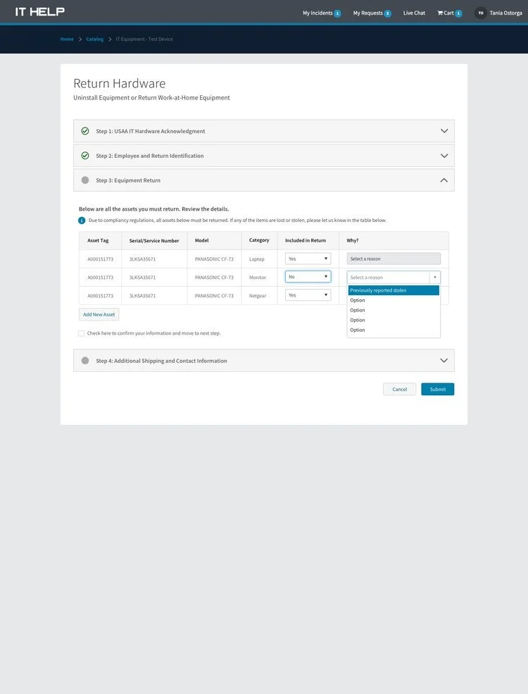 Initial testing for new hardware return form. Used wireframes to test the end-to-end acknowledgment and submission process.